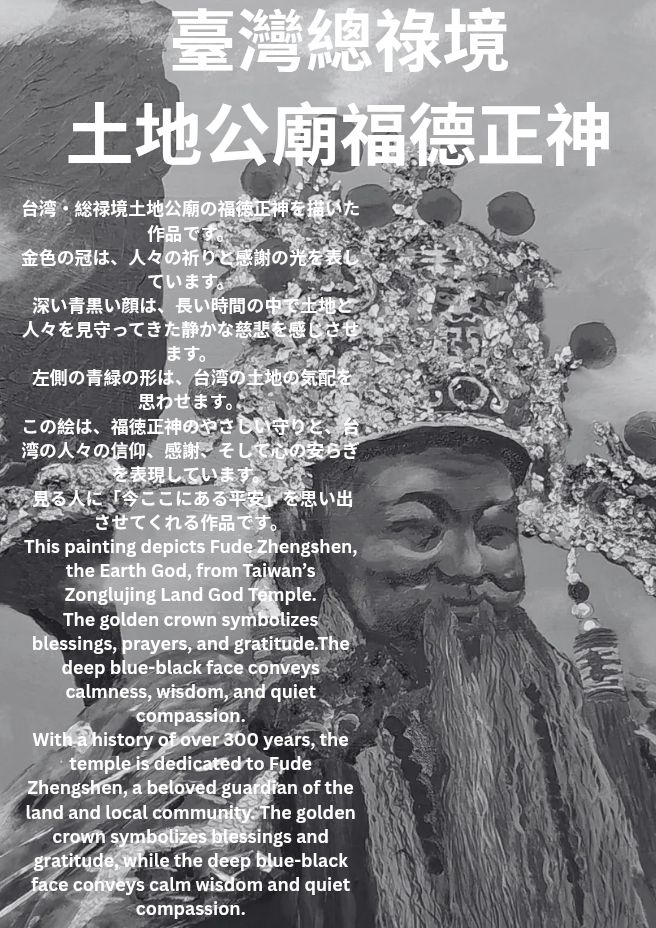 左側那塊青綠色的臺灣形影,非常關鍵。它不是單純的背景,而像土地公所守護的「地氣」。臺灣的山、海、雨水、稻田、老街、廟埕,都在這一片青綠裡。土地公的信仰之所以深,不是因為祂遠,而是因為祂近;祂近到每一戶人家的門口,近到一碗飯、一杯茶、一句「平安就好」。