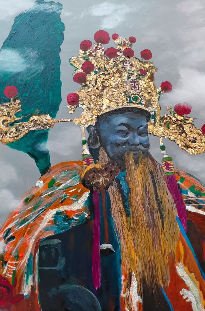 正念地看這幅畫,可以先把目光停在福德正神的臉上。不要急著判斷畫得像不像,也不要急著說喜不喜歡。只是看:看祂安靜的眼神,看鬍鬚如水流般垂下,看金箔在光裡微微起伏。然後問自己一句:我今天是否也能像土地一樣,承接一點不完美,仍然長出慈悲?